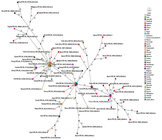 Based on RDP4 analysis, no recombination events were detected within the dataset. Sixty-one haplotypes were observed. The Algerian sequences are scattered across the network as demonstrated in Figure 5. For instance, Algeria/G35155-8850/2020|EPI_ISL_766864 clustered with sequences from Mexico, Sri Lanka, Austria, Netherlands, Turkey, Italy, Greece, Guadeloupe, Thailand, Belgium and formed one haplogroup. In contrast, each of the seventeen remaining sequences was considered as an individual haplotype. Algeria/G38599-8859/2020|EPI_ISL_766871, Algeria/G38218-8852/2020|EPI_ISL_766865, and Algeria/G35014-8856/2020|EPI_ISL_766869 were directly linked to the previously mentioned haplogroup. Similarly, Algeria/G0638_2264/2020|EPI_ISL_418241 and Algeria/G0640_2265/2020|EPI_ISL_418242 were directly interconnected. On the other hand, Algeria/G37138-8854/2020|EPI_ISL_766867 and Algeria/G41498-8846/2020|EPI_ISL_766861 were joined with the presence of a median vector indication missing unsampled data.