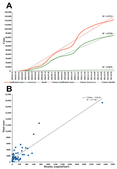 The R2 values regarding the time series plot of the cumulative confirmed cases were 0.62, 0.97, and 0.97 for the exponential, linear, and logarithmic trend lines, respectively. Likewise, the same results were observed regarding recovery cases. At the same time, the cumulative death cases exhibited the following R2 values: 0.77 for the exponential trend line, 0.99 for the linear, and the logarithmic model (Figure 6A). In parallel, the correlation coefficient calculated between the confirmed cases and the population density for each of the forty-eight Algerian cities was 0.78 (Figure 6B).