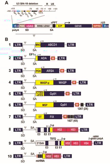 Historically, the first LV vectors were based on the usage of strong viral promoter/enhancer sequences, typically derived from the human CMV or the murine spleen focus forming (SFFV), stem cell (MSCV) or myeloproliferative sarcoma virus (MPSV). However, LV carrying these promoters were associated with severe side effects in clinical trials, and are no longer used at least for transduction of long-lived stem cells. Side effects included insertional mutagenesis caused by the long-range, cis-acting enhancing activity of viral elements on genes flanking the provirus insertion sites, or activation of host cell defense mechanisms leading to epigenetic silencing [46]. A number of preclinical studies showed that the activity of strong viral promoter/enhancers is the most significant factor driving clonal expansion and oncogenesis upon LV integration [47,48]. Viral elements have therefore been replaced by cellular promoters and regulatory sequences in most clinical applications. The only notable exception is the LV developed for gene therapy of adrenoleukodystrophy (ALD), in which a cDNA for the ATP-binding cassette, subfamily D, member 1 (ABCD1) is driven by a modified (MND) MPSV enhancer/promoter [14,17] (Figure 1B, #1).