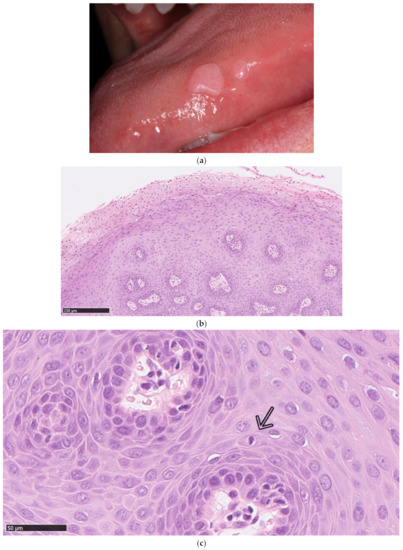 Clinical manifestations of focal epithelial hyperplasia (FEH). (a) Clinical photo of two minor FEH lesions located on the lateral side of the tongue. (b) Example of a histopathological examination of an FEH lesion (H&E stain) from a 56-year-old Danish female. The lesion was located on the inside of the lower lip and the diagnosis was based on the clinical and histopathological examination. The biopsy revealed a small, flat squamous papilloma with conspicuous koilocytosis that was characterized by several layers of cells with hyperchromatic nuclei with irregular contours and a perinuclear halo. HPV90 was detected with PCR using the VisionArray HPV Chip 1.0. There were no signs of dysplasia or malignancy. (c) Example of a mitosoid body (indicated by an arrow) from the FEH lesion described in (b).
