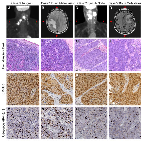 Clinical presentation and histology of primary and metastatic OPSCC. (A) A positron-emission tomography (PET) scan of Case 1 at the time of initial diagnosis, showing the primary tumor and spread to local lymph nodes. (B) A magnetic resonance imaging (MRI) scan was taken 16 months later, showing a right parietal mass in the brain. (C) A PET scan of Case 2 at the time of initial diagnosis, showing the neck mass and local spread to lymph nodes. (D) An MRI was taken 33 months later, showing a metastatic tumor in the left centrum. (E–P) Serial tissue sections from Case 1 (E,F,I,J,M,N) and Case 2 (G,H,K,L,O,P) were used for immunohistochemistry (IHC) and in situ hybridization analysis. (E–H) Primary and metastatic brain tumors were stained with hematoxylin and eosin. (I–L) Adjacent sections were assayed for p16INK4a protein expression by IHC. All tumors displayed high levels of nuclear and cytoplasmic staining of p16INK4a, a hallmark of HPV+ tumors. (M–P) Tumors were assayed for HPV16 and HPV18 RNA using the RNAscope HPV16/18 probe set. The presence of HPV RNA is evident in both initial (M,O) and metastatic brain tumors (N,P). This pattern directly matches the pattern of p16INK4a overexpression from the adjacent slides. L = left side, R = right side, A = anterior, P = posterior. Scale bar = 50 μm.