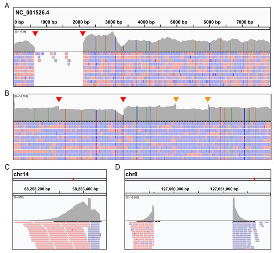 Characterization of human papillomavirus (HPV) integration in brain metastases by targeted sequencing. After sequencing the targeted libraries, reads were aligned to HPV16 reference genome (NC_001526.4) and visualized by IGV software. (A,B) Extensive coverage of the HPV genome was seen in both Case 1 (A) and Case 2 (B). Red arrows indicate discontinuities where chimeric reads between HPV and human genomes were detected. In addition, other discontinuities were detected in Case 2 (orange arrows). (C,D) In the lower panels, human DNA reads from chimeric HPV-human sequences are displayed, indicating an insertion site into the human genome at 14q24.1 (Case 1, (C)) and 8q24.21 (Case 2, (D)). Red (Forward) and blue (Reverse) colors correspond to specific strands.