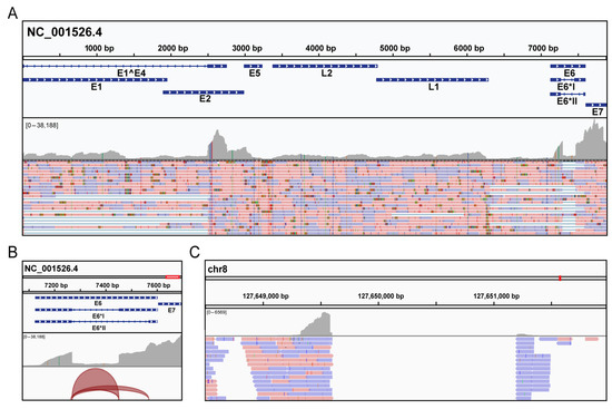Detection of HPV mRNA in Case 2 by targeted sequencing. Total RNA was first extracted from the Case 2 brain metastasis, followed by separation of the mRNA fraction using oligo dT magnetic beads. This was followed by cDNA library preparation and enrichment of HPV encoded cDNAs using the SureSelect protocols. After Illumina sequencing, reads were aligned to HPV16 reference genome (NC_001526.4) and visualized by IGV software. (A) Data revealed a high level of E6 and E7 expression in the tumor. (B) The junction track showing alternative splice junctions in the E6 gene. The E6*I splice junction had more coverage (8368 reads) than E6*II (1561 reads). (C) Consistent with the DNA sequencing, human reads were detected for the integration site at 8q24.21, indicating the presence of a chimeric mRNA encoded from both HPV16 and the host genome.