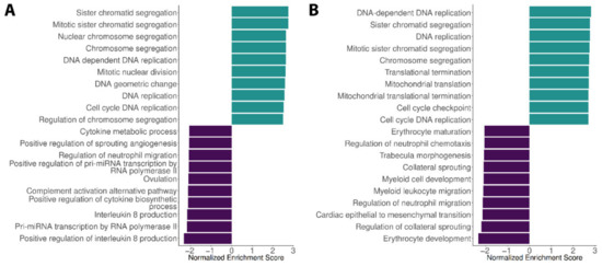 Top 20 Gene Ontology Biological Process (GO-BP) pathways in the (A) spleen and (B) liver cells (cut-off values: nominal p-value < 0.05 and FDR < 0.25). Positive normalized enrichment score (NES; in purple) represents upregulated pathways in the infected individuals versus controls, while negative NES values (in green) represent downregulated pathways in the infected individuals versus controls.