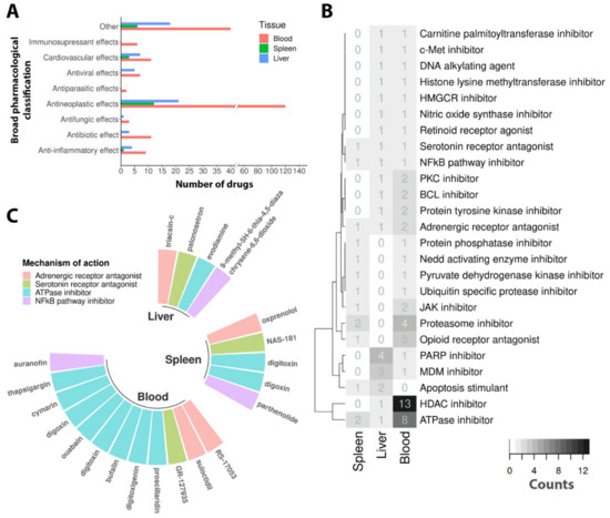 CMap-identified compounds (score equal to or below −90) that potentially impact Dengue haemorrhagic fever treatment, according to their mechanism of action in the blood, spleen and liver. (A) Bar plot of the distribution of drugs by broad pharmacological classification; (B) heatmap of drugs per mechanism identified in one or more tissues; (C) circus plot of common mechanisms of action.