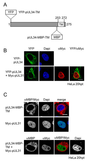 To exclude the interference of N-terminal tagging of pUL34 with its structural integrity potentially having an influence on its interaction with pUL31, an MBP-tag was inserted between residues 235 and 236 prior to the pUL34-TM domain, representing an unstructured region (Figure 1A,C). The transient expression of pUL34-MBP-TM, again exposing a cyto-/nucleoplasmic domain of about 75 kDa, resulted in a similar ER-like distribution as observed with YFP- and MBP-pUL34. In presence of Myc-pUL31, the subcellular distribution of pUL34-MBP-TM was unaltered, and both proteins located to separate subcellular entities. Together, these data indicate that pUL34 and pUL31 do not interact in the cytoplasm and that the membrane-anchored pUL34 needs to access a nuclear transport mode different from pUL31.