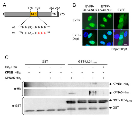 - HSV1 pUL34 contains a functional bipartite NLS that mediates the physical interaction with transport factors of the importin α/β family and the nuclear import of an unrelated cytoplasmic protein.