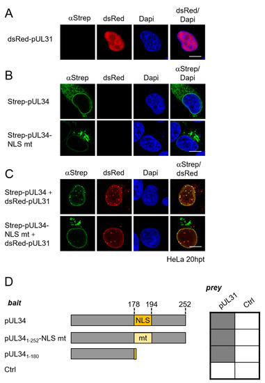 To determine the relevance of the pUL34-NLS for the targeting of the full-length protein to the nuclear rim, the subcellular distribution of Strep-pUL34 was compared to the NLS mutant Strep-pUL34-NLS mt in the absence and presence of its NEC partner pUL31. In the absence of pUL31, wild-type Strep-pUL34 was localized to the ER and the nuclear periphery (Figure 3B). In contrast, the pUL34-NLS mt was primarily found at Golgi-like structures (Figure 3B). Upon co-expression with dsRed-pUL31, that alone was located to the nucleoplasm (Figure 3A), and wild-type pUL34 was efficiently recruited to the nuclear rim (Figure 3C), consistent with previous results [12,35,36]. If co-expressed with dsRed-pUL31, pUL34-NLS mt is recruited to the nuclear periphery with some residual localization of pUL34-NLS mt to Golgi-like structures. In either case, however, intense co-localizations of pUL34 and pUL31 resembling vesicular structures were observed at the nuclear periphery, consistent with NEC formation and budding activity (Figure 3C).