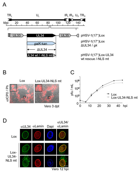 To determine the importance of the pUL34-NLS for viral replication, the UL34 locus of pHSV1(17+)Lox was replaced by the galK-kan selection cassette, which, in turn, was replaced either by wild-type UL34, resulting in pHSV1(17+)Lox-UL34 wt rescue (Lox), or by UL34-NLS mt, resulting in pHSV1(17+)Lox-UL34-NLS mt (Lox-UL34-NLS mt; Figure 2A, Figure 5A). Viral propagation of the mutant virus compared to the wild-type virus was investigated based on plaque formation as well as growth kinetics. Lox as well as Lox-UL34-NLS mt revealed comparable plaque sizes observed three days after the transfection of Vero cells with the respective BAC-DNA (Figure 5B). A detailed analysis of growth kinetics revealed that Lox-UL34-NLS mt showed 36–48 hpi when the virus yield plateaued, and about half a log difference in virus yield compared to Lox was observed, indicating a modest impairment in virus replication (Figure 5C).
