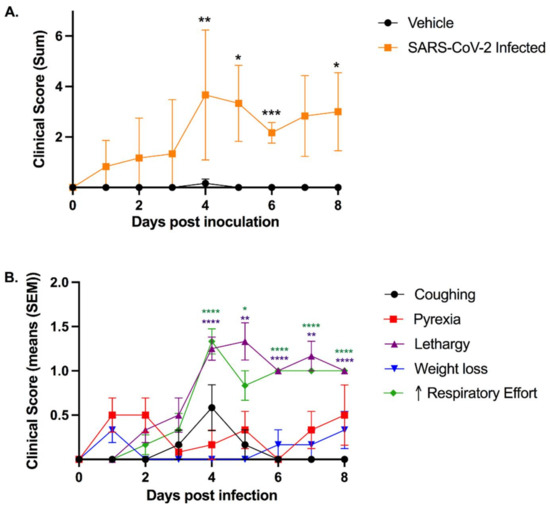 In order to clinically assess the feline model in Animal Biosafety Level-3 conditions, a clinical scoring system for feline respiratory disease was developed by integrating features of previously utilized systems [47,48,49] (Table 1). SARS-CoV-2-infected cats exhibited a significant increase in clinical disease scores starting at 4 days post-inoculation (dpi) and then at 5, 6, and 8 dpi when compared to sham-inoculated controls (Figure 1A).