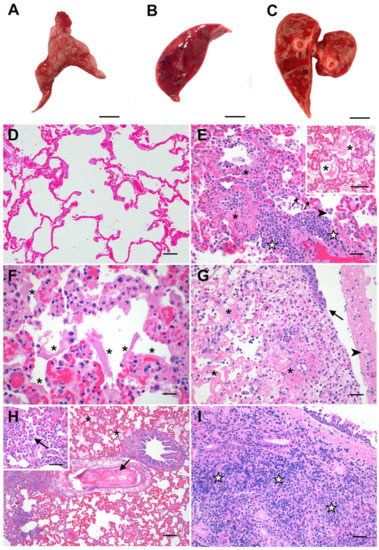 Pathologic features of acute SARS-CoV-2 infection in cats are analogous to the exudative phase of COVID-19. Compared to lungs from healthy sham-inoculated cats (A), the lungs of SARS-CoV-2-infected cats were diffusely consolidated, dark red, and edematous at both 4 dpi (B) and 8 dpi (C). The lungs of healthy, uninfected cats (D) were histologically normal, with open alveoli and minimal atelectasis. At 4 dpi, the lungs of SARS-CoV-2-infected cats (E) exhibited discrete foci of alveolar inflammation and necrosis with fibrin deposition (✱), increased alveolar macrophages (arrowhead), perivascular lymphocytes (☆), and type II pneumocyte hyperplasia (arrows). The alveoli in these cats’ lungs were frequently filled with large amounts of edema and fibrin strands ((E) inset), and there were multifocal areas of hyaline membrane formation (F) (✱). The distal trachea of one SARS-CoV-2-infected cat (G) was multifocally ulcerated at 4 dpi (arrow) with diphtheritic membrane formation (arrowhead) and multifocal areas of submucosal necrosis and fibrinoid vasculitis (✱). At 8 dpi (H), fibrinoid vasculitis, vascular thrombosis (arrow), and occasional syncytial cells (H inset) were observed in addition to the histopathologic changes described above. Tracheal lesions observed at 8 dpi (I) were characterized by varying degrees of lymphoplasmacytic, histiocytic, and neutrophilic inflammation, with multifocal areas of submucosal necrosis. Magnification: (A–C) scale bar = 1 cm; (D,H) 10×, scale bar = 100 µm; (E) 20×, scale bar = 50 µm; ((E) inset, (G), (H) inset, (I)) 40×, scale bar = 25 µm; (F) 60×, scale bar = 17 µm.