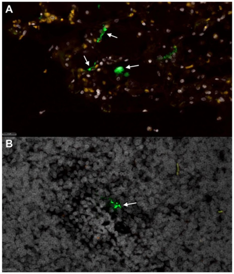 Fluorescent immunohistochemistry for SARS-CoV-2 nucleoprotein identifies mononuclear cells in tracheobronchial lymph nodes of intratracheally infected cats. Low numbers of SARS-CoV-2 positive cells (green, white arrows) are detected in (A) positive control tissue (lung) from an African Green Monkey infected with SARS-CoV-2 [50], and within (B) mononuclear cells in the TBLN of SARS-CoV-2-infected cats (green, white arrow). White, DAPI/nuclei; green, CoV-2. Magnification 40×, scale bar = 20 µm.