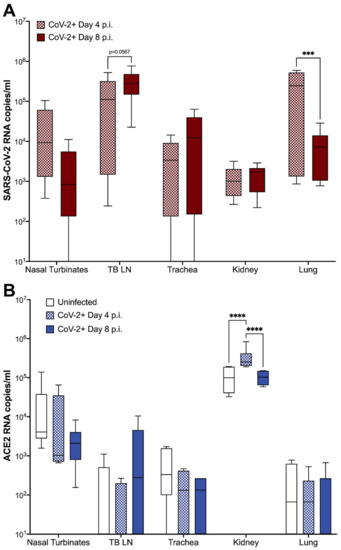 When applicable, data were expressed as means ± SEM and statistically analyzed using GraphPad Prism 9.0 software (La Jolla, CA, USA). Kruskal–Wallis test, Pearson correlations, and ANOVA were used to compare differences in clinical score, histopathology, SARS-CoV-2 viral load, and ACE2 RNA among uninfected and SARS-CoV-2-infected individuals, between sample type, for each tissue individually, and between tissues. For all significant results, pair-wise comparisons were made by post-hoc analysis. p-values < 0.05 were considered significant.