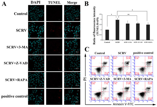 In Figure 2B, we have used the TUNEL assay to evaluate the EPC cells apoptosis after SCRV infection. Interestingly, in addition to Z-VAD-FMK, another autophagy inducer, rapamycin, could also resist the induction of apoptosis in SCRV-infected EPC cells. In the infected cells, rapamycin could reduce the red apoptotic signals in the TUNEL assay (Figure 2A,B). Besides that, flow cytometry analysis of AV/PI double-stained cells also confirmed the decline of apoptotic cells in SCRV-infected group (Figure 2C), whose proportion came to 19.0% in EPC cells. These results preliminarily proved that induction of autophagy can combat the occurrence of apoptosis and promote the survival of EPC cells.