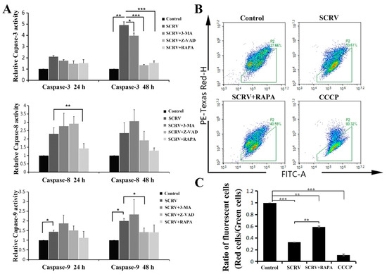 Effects of autophagy or apoptosis inhibitors on the SCRV-infected EPC cells. (A) Detection of caspase-3, -8 and -9 activities in SCRV-infected cells at 24 h and 48 h, respectively. The infected cells were co-treated with Z-VAD (100 μM), 3-MA (5 mM) and RAPA (1 μM), respectively. (B) Flow cytometry analysis of SCRV-infected cells after rapamycin co-treatment at 48 h. (C) Statistical analysis of ratios of fluorescent cells (red cells/green cells in Figure 3B), which suggested that rapamycin could reduce the proportion of apoptotic cells, comparing with SCRV-only infection group. p < 0.05 (*), p < 0.01 (**) and p < 0.001 (***).