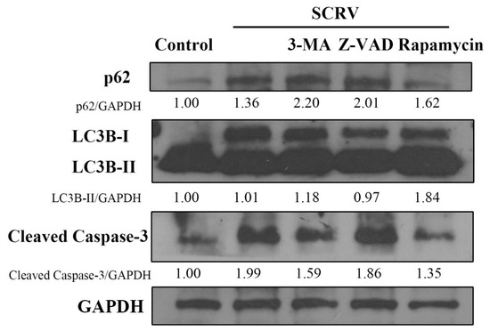 Furthermore, Western blotting analysis was carried out to confirm the crosstalk relationship between autophagy and apoptosis induced by SCRV in EPC cells. The results showed the increase in autophagy marker protein LC3B-II (Figure 4), which further demonstrated the activation of autophagy in SCRV-infected cells. Interestingly, another autophagy marker factor, the expression of p62, also increased at 24 h, which suggested the blockage of autophagic flux. In addition, there is no notable statistical expression difference of LC3B and p62 when pretreated with Z-VAD-FMK in virus-infected cells. However, the autophagy inducer, rapamycin, could obviously inhibit expression of the apoptosis-related protein, caspase-3. This further suggested that autophagy could have an impact on the apoptosis in SCRV-infected EPC cells.