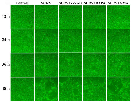 In order to study the impact of autophagy and apoptosis on SCRV replication and cell proliferation in EPC cells, we observed the occurrence of CPE after Z-VAD-FMK and rapamycin treatment at different time points, respectively. At 24 h, the cell monolayer was better in the SCRV plus Z-VAD-FMK or rapamycin-pretreated group than that in the positive infection group. Moreover, less CPE were captured after microscope detection at 48 h (Figure 5). Subsequently, our results suggested that both Z-VAD-FMK and rapamycin could effectively delay the emergence of CPE and cell death caused by SCRV infection. On the contrary, autophagy inhibitor treatment (3-MA) could help CPE to progress in SCRV infection, and most of the cell monolayer had been broken (Figure 5).