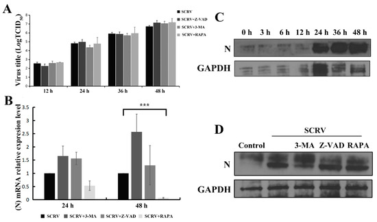 Rhabdovirus nucleoprotein (abbreviated N) is a key player for the replication and assembly of viruses. Herein, we continued to explore the impacts of autophagy or apoptosis on the N mRNA level and its protein expression after different chemical treatment in SCRV-infected EPC cells. Present qRT-PCR analysis indicated that rapamycin could reduce the N gene mRNA level of SCRV at 48 h, revealing significant statistical differences with that of virus-infection group (Figure 6B). Moreover, expression of SCRV N protein exhibited a gradual increase trend in a time-dependent manner from 0 h to 48 h (Figure 6C). Unexpectedly, no apparent change of N expression level was detected after rapamycin treatment (Figure 6D). Future work should focus on the post-transcriptional modification or translation of the N protein of SCRV-infected EPC cells after different chemical treatments.