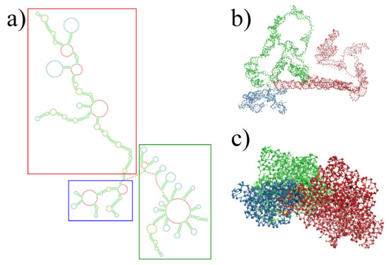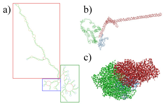 Full reconstruction of the STMV in vitro genome. (a) Secondary structure proposed by Weeks and co-workers [27], with colored rectangles distinguishing each domain: blue for 5′ domain, red for central T domain and green for 3′ domain. (b) Reconstruction after assembly and energy minimization and (c) after SMC simulation with a minimum radius of gyration.