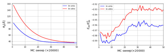 The three-dimensional in virio and in vitro models of the STMV genome are shown in Figure 2 and Figure 3. Each decoy was minimally supervised, obtaining a refined structure with no broken bonds, nor clashes, nor knots between their components. Nevertheless, their extension is far from the dimensions inside a virus, reaching a radius of gyration of 99 Å for the in virio model, which yields a maximum distance of 182 Å between a phosphate group and the center of mass. Clearly, these values are well beyond the radius of the STMV, including its capsid, which is approximately 85 Å. A SMC simulation was performed for minimizing the radius of gyration for 1,000,000 MC sweeps ( Å, Å), which maintains the secondary structure restraints. We observed that both structures can reach a compact state in a similar amount of time, under the effect of a strong bias on the radius of gyration, as seen in Figure 4. Nevertheless, the backbone energy reaches a higher value for the in vitro structure, which suggests that a higher deformation of the molecule has to take place in order to satisfy the spatial restraint. The RMSD (with a cutoff of 100), which enforces the secondary structure, increases by around 5% in both cases, which expresses that the structure of the restrained stems is minimally affected.