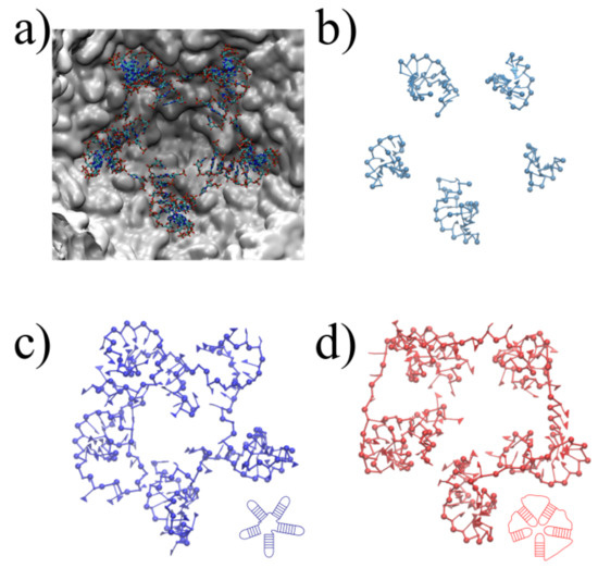 An optimal determination of the 3D encapsidated structure of the RNA genome goes beyond the capabilities of the current RNA–protein interaction modeling, which was discussed and conceptualized under different hypotheses, specifically for virus assemblies [44,45,46,47]. Nevertheless, we aim to present a systematic and reasonable model, which brings a new methodology, to structurally interpret, explain and evaluate the feasibility of the chemically probed secondary structures and the further microscopic characteristics of confined RNA inside virus capsids. We illustrate the application of SMC simulations on a fragment of the 3′ domain, which comprises nucleotides 772 to 897. This fragment is composed of five sequential hairpins, which shows resemblance to the secondary structure models proposed earlier [35]. It also serves as an initial benchmark to test the steering around a five-fold symmetry axis, as illustrated in Figure 5a, using the stems determined experimentally as templates for the SMC simulation. Despite the simplicity of this benchmark, note that the arrangement of the structure is not uniquely defined. Such heterogeneity relies mainly on two different scenarios, with the hairpins inward and outward to the pentameric center, as illustrated in Figure 5c,d. Starting from three different initial conformations relaxed after 50,000,000 MC sweeps, we impose the RMSD restraints to observe a final structure that resembles the template, depicted in Figure 5c. We monitor the backbone energy per nucleotide (Figure 6), in reduced units, where we find that, in fact, the additional stretching present in scenario two (inwards conformation) is well reflected in the backbone energy, regardless of the initial configuration. Moreover, the RMSD reaches considerably lower values, independently of the initial condition, which states that the inward scenario can become entangled more easily during the simulation. Once the energetically correct scenario under a efficient coarse-grained representation is determined, our method also offers a direct way of backmapping, should the microscopic application demand so.