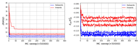 RMSD as a function of MC sweep for inward and outward scenarios (left) and normalized backbone energy (right) normalized by a reference single strand in A-form structure. The used RMSD adimensional cutoff is 20.