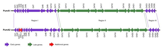 The genomes of both PumA1 and PumA2 can be separated into three different modules based on the direction the genes are transcribed (Regions I, II, and III) (Figure 2). Regions I and III (also known as the early genes) contain genes that are transcribed in the same direction and are located at the 5′ and 3′ ends of the genomes. Region II (also referred to as the late genes) is located in the center of the genome and is transcribed in the opposite direction to the other genes [9].