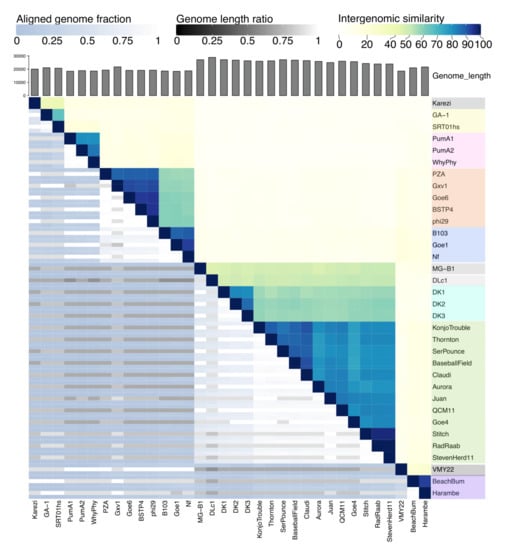 - Russell, D.A.; Hatfull, G.F. PhagesDB: The actinobacteriophage database. Bioinformatics 2016, 33, 784–786. [Google Scholar] [CrossRef] [PubMed]
