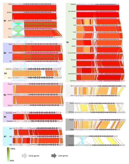Dot plot analysis of the 34 genomes revealed six clusters and two phages not pertaining to a cluster, referred to as singletons (Figure S2). To further define the clusters and provide a numerical value to their similarities, we used the Virus Intergenomic Distance Calculator (VIRIDIC) to calculate intergenomic similarities between each phage. VIRIDIC combines several similarity algorithms with genome alignment and length ratios to capture overall relatedness of prokaryotic viruses [33]. In correlation with the dot plot analysis, the heatmap presents the 34 phages in the same clustering pattern (Figure 3). Each cluster shares similarities of between 65.65–99.87% (Table S2). The clusters are now referred to as from B1 to B7, expanding from previous clusters [20].