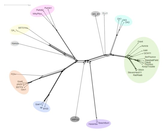 Reticulate networks have been recently shown to provide an accurate representation of phage relatedness versus traditional rooted phylogenetics, since phages undergo many recombination and horizontal gene transfer events [66]. To test if these methods aligned with the comparison methods previously mentioned, two reticulate methods were used. Firstly, an unrooted phylogenetic network was created in Splitstree4 using whole genome CLUSTAL Omega alignment (Figure 5). This network showed a consistent pattern of clustering in agreement with the other techniques.