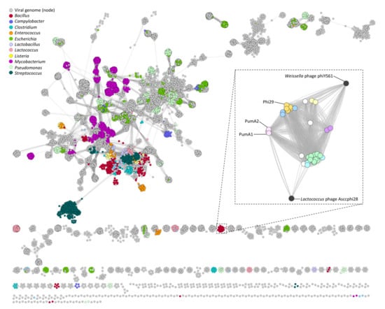 vConTACT v.2.0 was then used in conjunction with the Splitstree network. vConTACT v.2.0 is a newly developed software for virus classification that extracts, aligns, and clusters all predicted input proteins [37]. The protein clusters are then used to calculate viral clusters (VC) by am “edge” weight or statistical confidence due to the amount of protein clusters that each phage shares. This is compared to a global network of phages in the GenBank database. Figure 6 depicts the global network produced from vConTACT v.2.0 with various phages color coded by their host genera. The phi29-like phages are not connected to the main network, showing little gene-sharing outside of this group of phages. When the phi29-like network is expanded, there is a clear differentiation of each phage cluster, denoted by the individual cluster colors. While these phages do not connect to the main network, they share proteins with two other phages that are not infective for Bacillus, Lactococcus phage Asccphi28 [67] and Weisella phage phiYS61 [68], which are genotypically similar to the phi29-like phages. This form of reticulate phylogenetics helped corroborate the established clusters previously outlined and is an accurate tool for investigating phage gene-sharing and evolution.