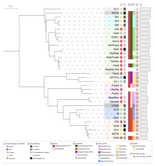 Grose et al. [20] conducted a thorough analysis of 93 Bacillus phage sequences and generated clusters based on genomic similarities. The groupings were based on that described previously for the Mycobacterium phages [21] and the phi29-like phages [22]. Cluster B was noted for phages relating to phi29, now classified in the Salasvirus genus. At the time, a small subset of phage sequences was available and was classified into three sub-clusters, including phi29 and PZA (grouped in sub-cluster B1), B103 and Nf (sub-cluster B2), and GA-1 (sub-cluster B3) [20]. In 2018, Schilling, Hoppert, and Hertel [9] discussed 21 phi29-like phage sequences available in GenBank, providing preliminary insights into this group’s genetic relatedness [9]. However, due to advances in viral classification techniques and the addition of other phi29-like phages in Genbank, this work is outdated. Recently, Li, et al. [23] isolated one of the newest members of this group, DLc1, and concluded that the now present 30 phi29-like phages should be included within the Salasvirus genus. However, this study failed to use multiple reticulate phylogeny methods for this classification and relied only on basic genome comparison methods. As of earlier this year, the International Committee on Virus Taxonomy (ICTV) reviewed the phi29-like phages and classified them in the new Salasmaviridae family [24]. However, within this report there were no detailed conclusions about these new taxonomic rankings, therefore, validation of this work is needed.