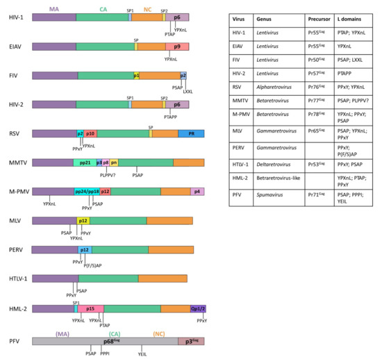 Retroviral Gag organization domains. All retroviruses display matrix domain (MA, in violet), capsid (CA, in green), and nucleocapsid (NC, in orange). Spacer peptides (SP) and peptide sequences containing L domains are indicated within structural precursors of HIV-1, EIAV, FIV, HIV-2, RSV, MMTV, M-PMV, MLV, PERV, HTLV-I, HML-2, and PFV.