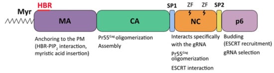 All retroviruses express structural Gag polyproteins that drive the assembly and the release of virus-like particles (VLPs), even in the absence of other viral components (for reviews, see [33,34]), and all retroviral Gag precursors contain the three structural domains of matrix (MA), capsid (CA), and nucleocapsid (NC), each of them playing an essential role in the retroviral particle assembly and in budding processes. Gag usually also carry additional domains and spacer peptides such as, for example, the HIV-1 p6 domain, as well as SP1 and SP2 linkers (for reviews, see [34,35,36,37]) (Figure 3).