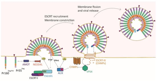 The recruitment of the ESCRT cellular factors by L domains in HIV Pr55Gag ensures viral particles release. The cellular factor angiomotin (AMOT) promotes the recruitment of the ubiquitin ligase NEDD4L at HIV-1 budding sites. The ESCRT machinery is then recruited by NEDD4 family, and this interaction seems to be related to the ubiquitination of viral structural proteins. The P(T/S)AP L domain of Pr55Gag recruits the ESCRT-I factor TSG101 at viral assembly sites by direct binding to its ubiquitin E2 variant (UEV) domain, and the YPXnL motif recruits the ESCRT-III-associated factor ALIX by binding to its V domain. The ESCRT-III proteins drive the interaction with the VPS4 ATPase. This late-acting factor leads to membrane remodeling and its fission, and it drives the disassembling of the ESCRT-III filaments. The process ends with the release of the newly formed viral particle.