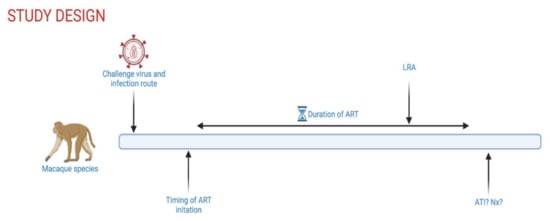Schematic overview of controllable experimental parameters in NHP HIV-1 cure studies. ART, antiretroviral therapy; LRA, latency reversing agent; ATI, analytical treatment interruption; Nx, elective necropsy. Created with Biorender.com.