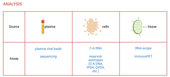 Among the various in situ technologies available, RNAscope has become the most-widely used method to track HIV-1 and SIV infection within anatomically intact tissue compartments [25,78,79,80,81]. This next-generation in situ hybridization method specifically and sensitively detects viral particles and cells expressing viral RNA. Cell phenotyping can be performed within the same tissue section, thus allowing for cellular and anatomical characterization of the reactivating viral reservoir. Another method using immunoPET (antibody-targeted positron emission tomography) has been developed specifically to capture total-body SIV replication, with the exception of the CNS [82]. Poly(ethylene glycol)-modified, 64Cu-labeled SIV gp120-specific antibody is administered intravenously to macaques to monitor kinetics of viral replication in tissues over time. Of note, this whole-body imaging method can be repeated within the same animal without adverse effects and does not require sacrifice of the animal. In ART-suppressed rhesus macaques, SIV was visualized by immunoPET in multiple tissues, including colon, spleen, and nasal-associated lymphoid tissue. Recently, this method was also used to study viral rebound in SHIV-infected RM infants, showing a rapid expansion of infected cells in the gastrointestinal tract after ATI [83]. SHIV Env-expressing cells were detected in tissues prior to the rebound in viremia, suggesting that ImmunoPET could be used to evaluate LRA-induced viral reactivation.