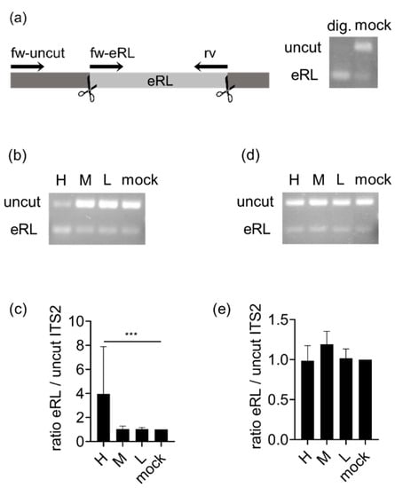 RNA was isolated using Trizol (Cat. No. 15596018, Invitrogen, Carlsbad, CA, USA) according to the manufacturer’s instructions. DNA contaminations were removed using DNase I by Roche (Cat. No. 4716728001, Basel, Switzerland). The ratio of eRL to uncut ITS2 was determined as described previously [10] using QuantiTect Reverse Transcription Kit (Cat. No. 205311, Qiagen, Hilden, Germany) and DreamTaq Green PCR Master Mix (2X) (Cat. No. K1081, Thermo Scientific). Band intensity was measured using GelQuantNET (omicX, Le Petit-Quevilly, France).