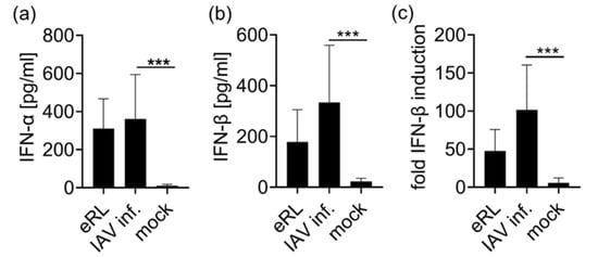 After verifying eRL generation in response to IAV infection, we tested immunostimulatory activity of virus-induced RNA species. RNA extracted from IAV-infected cells or mock treated cells was used to stimulate PBMCs, then IFN-α and IFN-β release was determined in ELISA (Figure 2a,b). In contrast to the RNA extracted from mock-treated cells, RNA derived from IAV-infected cells induced a type I IFN response in human PBMCs.