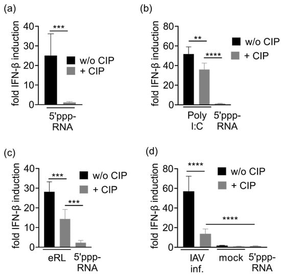 HEK293-RIG-I-IFN-β reporter cells were stimulated with RNA ligands with or without CIP treatment and fold IFN-β induction was determined after 20 h. Graphs depict three independent experiments each in biological triplicates (nine measurements per data point ± SD). (a) Stimulation with 5′ppp-RNA ± CIP. *** p < 0.001. (b) Stimulation with Poly I:C ± CIP and CIP-treated 5′ppp-RNA. ** p < 0.01, **** p < 0.0001. (c) Stimulation with eRL ± CIP and CIP-treated 5′ppp-RNA. *** p < 0.001. (d) Stimulation with RNA extracted from IAV-infected cells ± CIP, mock-infected cells ± CIP and CIP-treated 5′ppp-RNA. **** p < 0.0001.