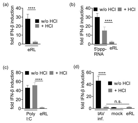 To elucidate whether IAV-induced RNA stimulates type I IFN release due to eRL activity, we focused on 2′3′ cyclic phosphate which is crucial for eRL function. Treatment with low HCl concentrations was previously shown to hydrolyze 2′3′ cyclic phosphate structures without affecting RNA integrity [21,22,23]. Indeed, HCl treatment abolished the immunostimulatory potential of eRL in HEK293-RIG-I-IFN-β reporter cells (Figure 4a), whereas both 5′ppp-RNA and Poly I:C, not depending on cyclic phosphate, were still immunostimulatory after HCl treatment (Figure 4b,c). However, IAV-induced RNA species were not immunostimulatory anymore after HCl treatment (Figure 4d). Consequently, IAV infection of HEK 293T cells induce immunostimulatory features which are identical to the eRL. Though VSV infection did not induce detectable amounts of eRL cleavage, immunostimulation by VSV-induced RNA species was also sensitive to HCl treatment (Figure A5). Cell viability was not affected by HCl treatment of RNA ligands, as HCl was neutralized with NaOH prior to immunostimulation (Figure A6).