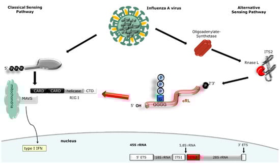 RIG-I activation by endogenous RNA fragments has been reported in several studies [9,10,24]. However, the origin and structure of the eRL has remained enigmatic for a long time. We were the first to show that the eRL is excised from the ITS2 region of 45S rRNA and depends on 2′3′ cyclic phosphate and GTP-binding structures for its immunostimulatory activity, but did not include viral infections in this previous report [10]. Therefore, we aimed at investigating if the eRL is generated in viral infections and to what extent it contributes to RIG-I activation. Indeed, we show that IAV-infection leads to eRL cleavage, which amplifies the Type I-IFN-response to IAV RNA (Figure 5).