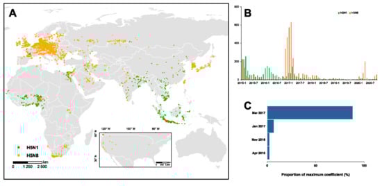 - Li, R.; Jiang, Z.; Xu, B. Global spatiotemporal and genetic footprint of the H5N1 avian influenza virus. Int. J. Health Geogr. 2014, 13, 14. [Google Scholar] [CrossRef] [PubMed]