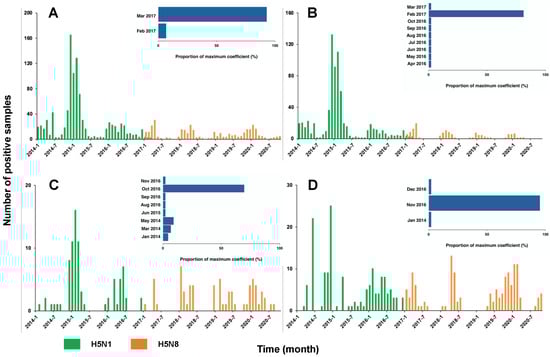 Numbers of positive HPAI H5N1 vs. HAPI H5N8 cases in Egypt 2014–2020. (A) Overall, (B) backyards, (C) farms, and (D) LBMs. The insets show the distribution of the timing for the maximum correlation of two subtypes.