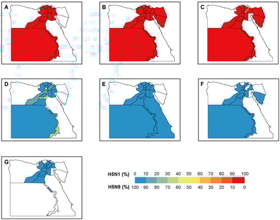 Distribution of H5N1 and H5N8 positive samples in Egypt. The proportions of positive sample of each subtype are shown by governorate in each year during (A–G) 2014–2020.