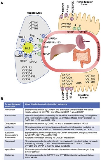 Key elimination pathways of commonly co-prescribed medications * [34,35,36,37,38,39,40,41,42,43,44,45,46,47,48,49,50,51,52,53]. (A) Location of drug-metabolizing enzymes and transporters of interest. (B) Elimination and distribution pathways for co-administered medications with islatravir *. ADA, adenosine deaminase; BCRP, breast cancer resistance protein; BSEP, bile salt export pump; CYP, cytochrome P450; MATE, multidrug and toxin extrusion protein; MDR1 P-gp, multidrug resistance protein 1 P-glycoprotein; MRP, multidrug resistance-associated protein; OAT, organic anion transporter; OATP, organic anion transporting polypeptide; OCT, organic cation transporter; NTCP, sodium taurocholate co-transporting polypeptide; UGT, uridine diphosphate glucuronosyltransferase. * Commonly prescribed co-medications taken from European Medicines Agency scientific advice on metabolic and elimination pathways for key medications expected to be taken concomitantly with islatravir.