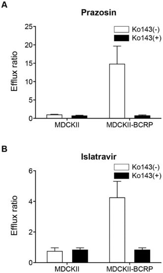 Bidirectional transport of islatravir across MDCKII and MDCKII-BCRP cell monolayers. (A) Positive control, efflux ratio of 1 μM prazosin across MDCKII and MDCKII BCRP cell monolayers, in the presence and absence of 5 μM Ko143 (control inhibitor). (B) Efflux ratio of 2 μM islatravir across MDCKII and MDCKII-BCRP cell monolayers after 3-h incubation, in the presence and absence of 5 μM Ko143. Efflux ratio: Papp (B to A)/Papp (A to B). The experiment was performed in triplicate, except for prazosin in MDCKII without Ko143 (n = 2). All data are mean ± SEM. BCRP, breast cancer resistance protein; SEM, standard error of the mean.