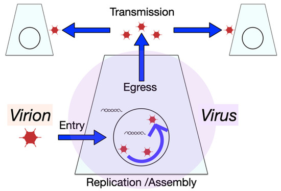 Virus infections are multi-step processes comprising entry, genome trafficking, activation of viral gene expression, replication of the genome, particle assembly, and release of progeny. Any virus infection depends on host factors, which are variably expressed in host cells. In fact, cell-to-cell variability in virus progeny production was reported as early as 1952 with a plaque assay of Western equine encephalomyelitis virus in chicken embryo cells by Dulbecco [1]. Infection variability comprises the multi-step virus entry process, the virion trafficking and dismantling, the initiation of gene expression or translation of the viral genome, the establishment of replication domains in the cytoplasm or the nucleus, and the subversion of egress pathways leading to progeny dissemination [2,3,4,5,6]. For a schematic depiction of a virus-centric view of infections, see Figure 1.