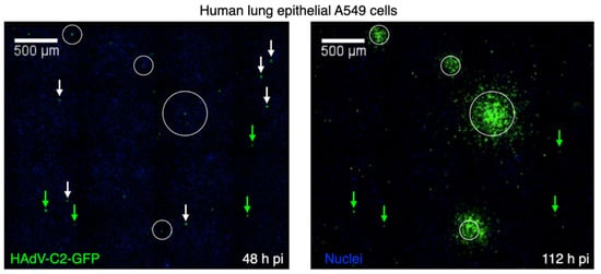 Cell-to-cell variability in plaque formation by HAdV-C2 revealed by single-cell time lapse fluorescence microscopy. Virus-infected cells and infection foci were visualized by EGFP expressed from the viral genome. Live cell plaque assay was conducted under agarose conditions, which restrict convectional spreading of cell-free extracellular virus particles and give rise to round plaque phenotypes, as described in [11]. Circled areas contain plaquing infections, green arrows indicate persistently infected non-plaquing cells, and white arrows indicate infected cells that were eliminated from the dish between 48 and 112 h pi. Nuclei are stained with Hoechst (weak signal in blue). Data from reference [11].