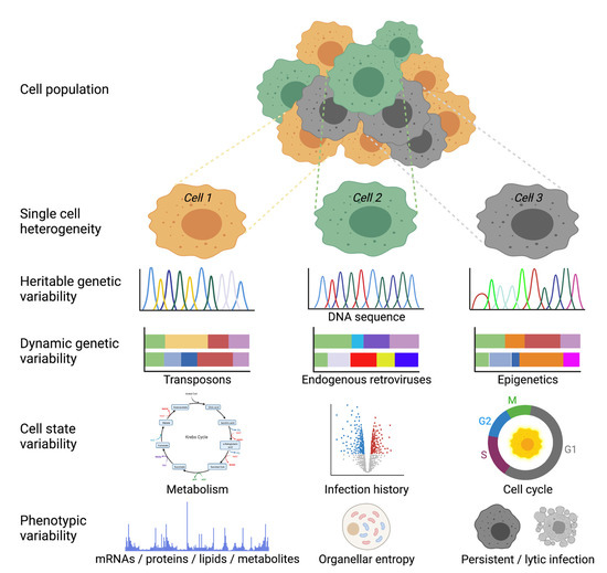 Cell-centric mechanisms underlying virus infection variability. Cells in a given population may be variable at the single-cell level due to at least four principle features: one is heritable genetic variability in the DNA sequence; two is dynamic genetic changes driven by mobile genetic elements or epigenetic differences; three is cell state differences, such as metabolism, infection history, or cell cycle; four is differences in phenotypes, such as macromolecules, organellar positioning with respect to each other (entropy), or the infection state. Figure was prepared by using BioRender.